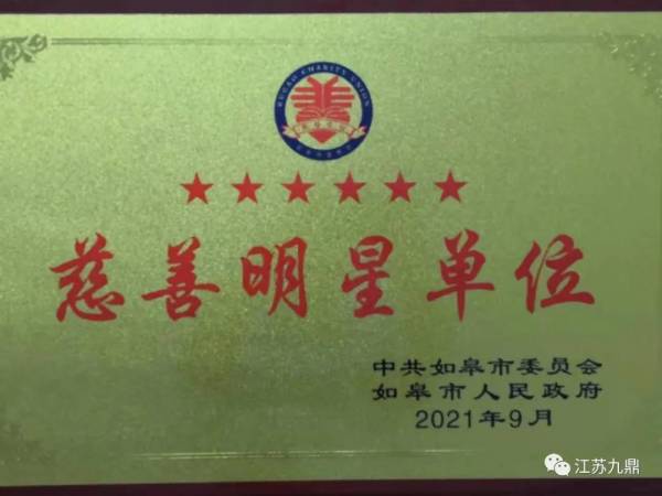 九鼎集团自2012年设立九鼎慈善救助基金以来,在董事长顾清波的带领下,始终弘扬张謇慈善精神,饮水思源,践行“鼎立天地、得报社会”的企业使命,近十年来,向如皋慈善基金会及社会捐款捐物三百多万元,为促进本地区慈善事业健康持续发展做出了贡献。