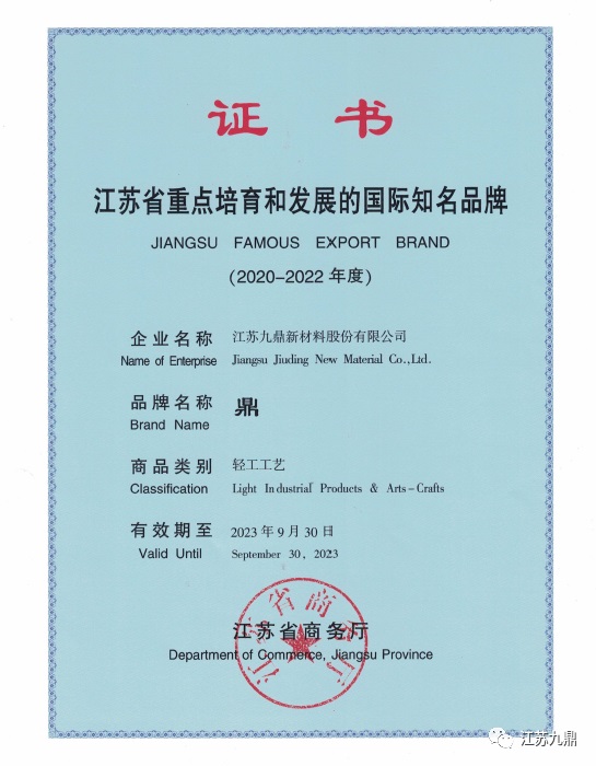 江苏九鼎新材料股份有限公司“鼎”牌再度获得《江苏省重点培育和发展的国际知名品牌》,这是九鼎新材自2007年以来连续十四年获此殊荣。(总经办提供)